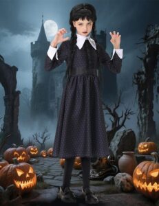 The slick black dress is not only stylish but also attractive and has a fitting match with different character themes. It has a soft wig that is easy to wear and fits the dress in a perfect way that gives the dress that cinematic appearance which children love. The socks are the last to be mentioned, but they are the necessary element to complete the well-polished look with a touch of spooky appeal. This set is available in various sizes to fit a good number of ages so that every girl who adores Halloween dress-up will have an ideal fit.